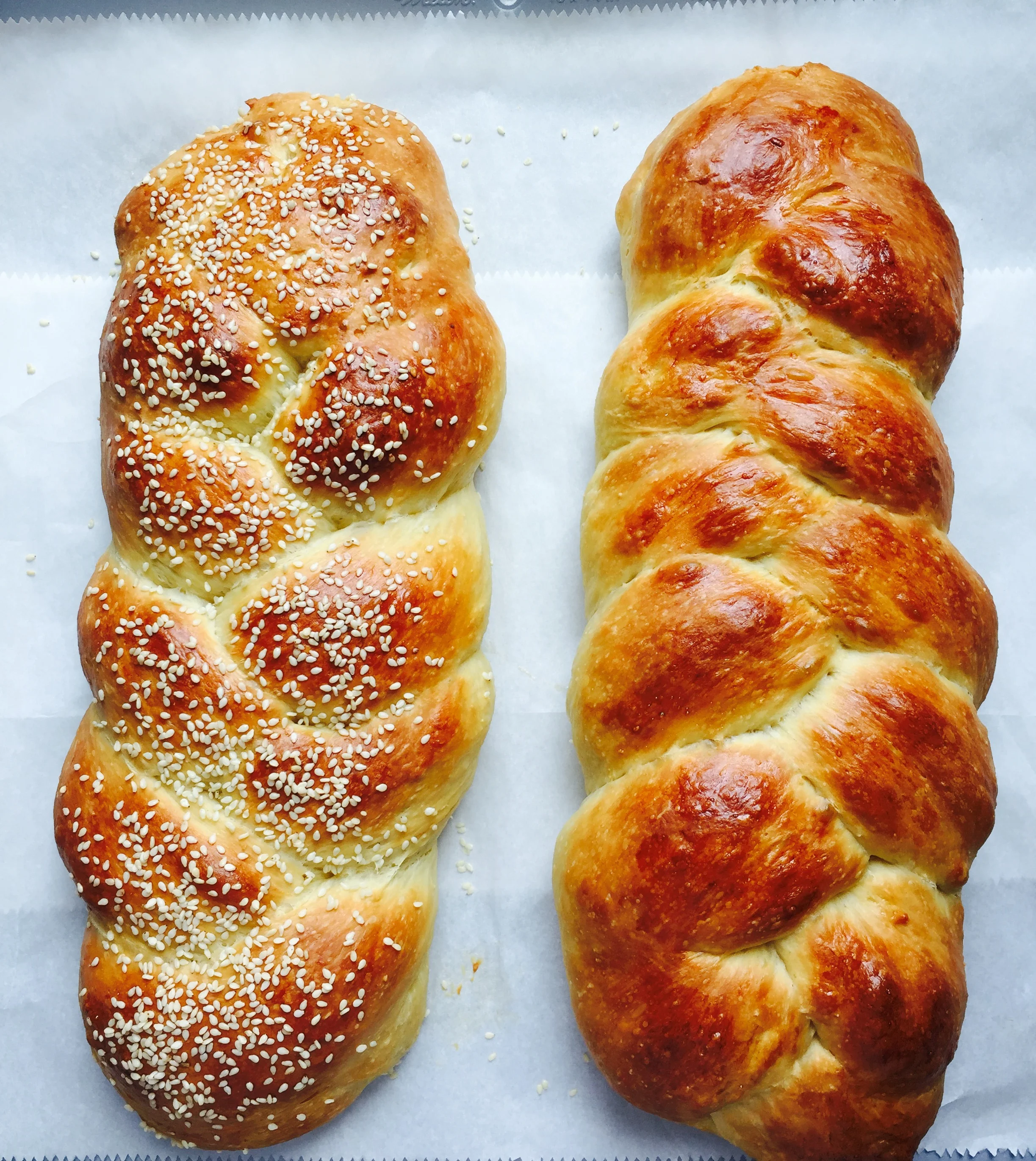 5. Cover a baking sheet with parchment paper and set aside. Divide dough in half and then each half into thirds. Roll each third into a strand, about 12 inches long and 3/4 inch in thickness. Use flour if needed, but sparingly so. Form two, three strand braids and transfer to the parchment-covered pan.